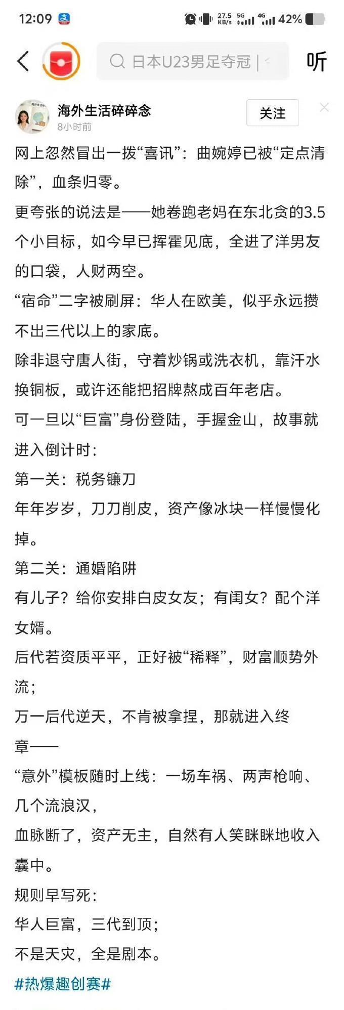 这名网友进一步指出,在欧美,华人作为“巨富”的身份往往难以避免“税务镰刀”和“通婚陷阱”。曲婉婷的经历正好证明了这一点:财富被稀释,失去了人脉,最终陷入了困境。
